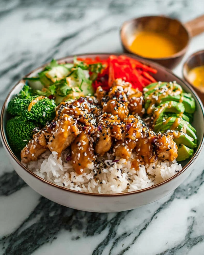 Lastly, don’t forget about presentation! A well-arranged bowl is more appetizing. Layer your ingredients thoughtfully, starting with the rice or quinoa, followed by the chicken, and then the vegetables. Drizzle the sauce artfully over the top and finish with fresh herbs or sesame seeds for a pop of color.